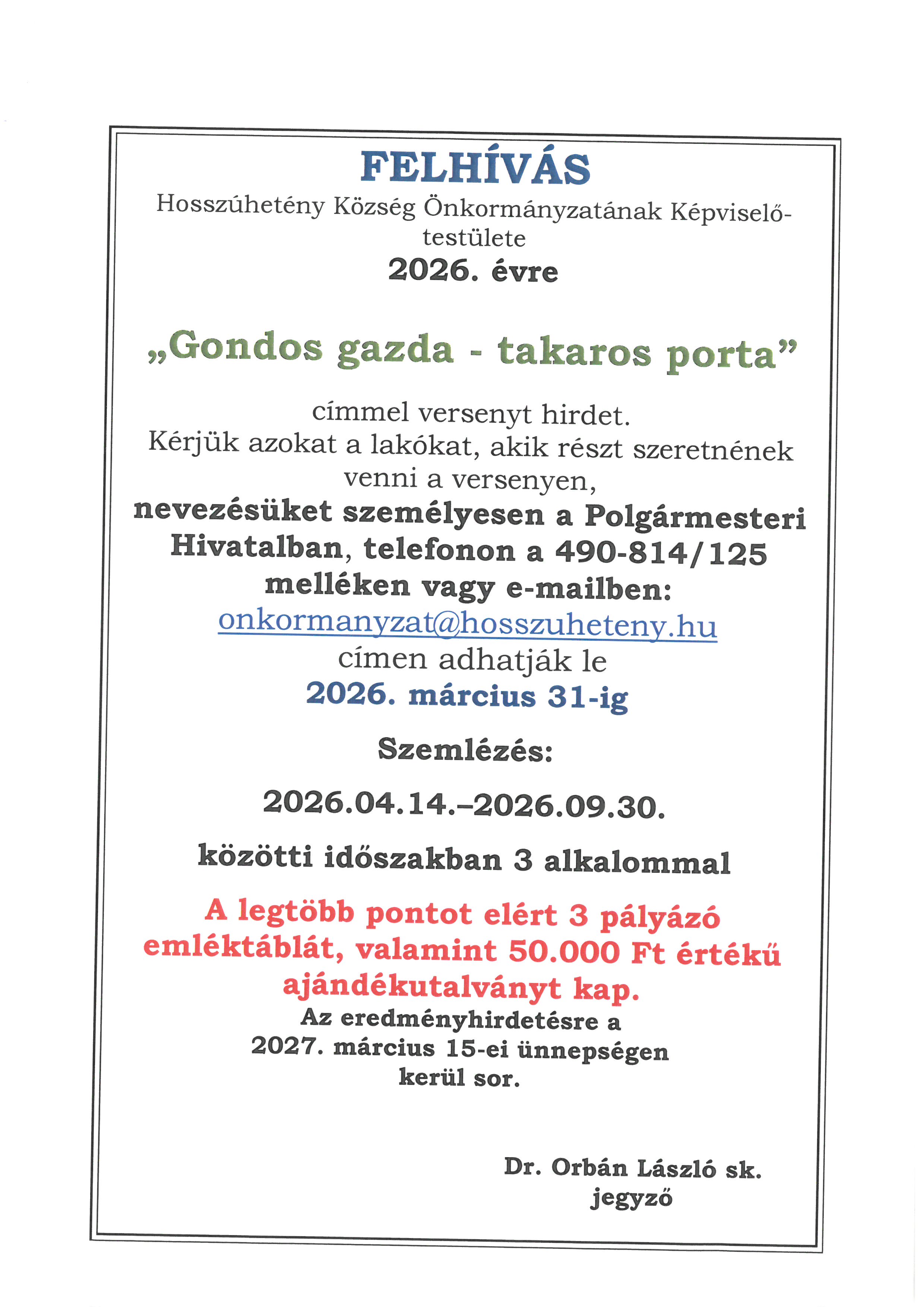 Felhívás "Gondos gazda -takaros porta" versenyre